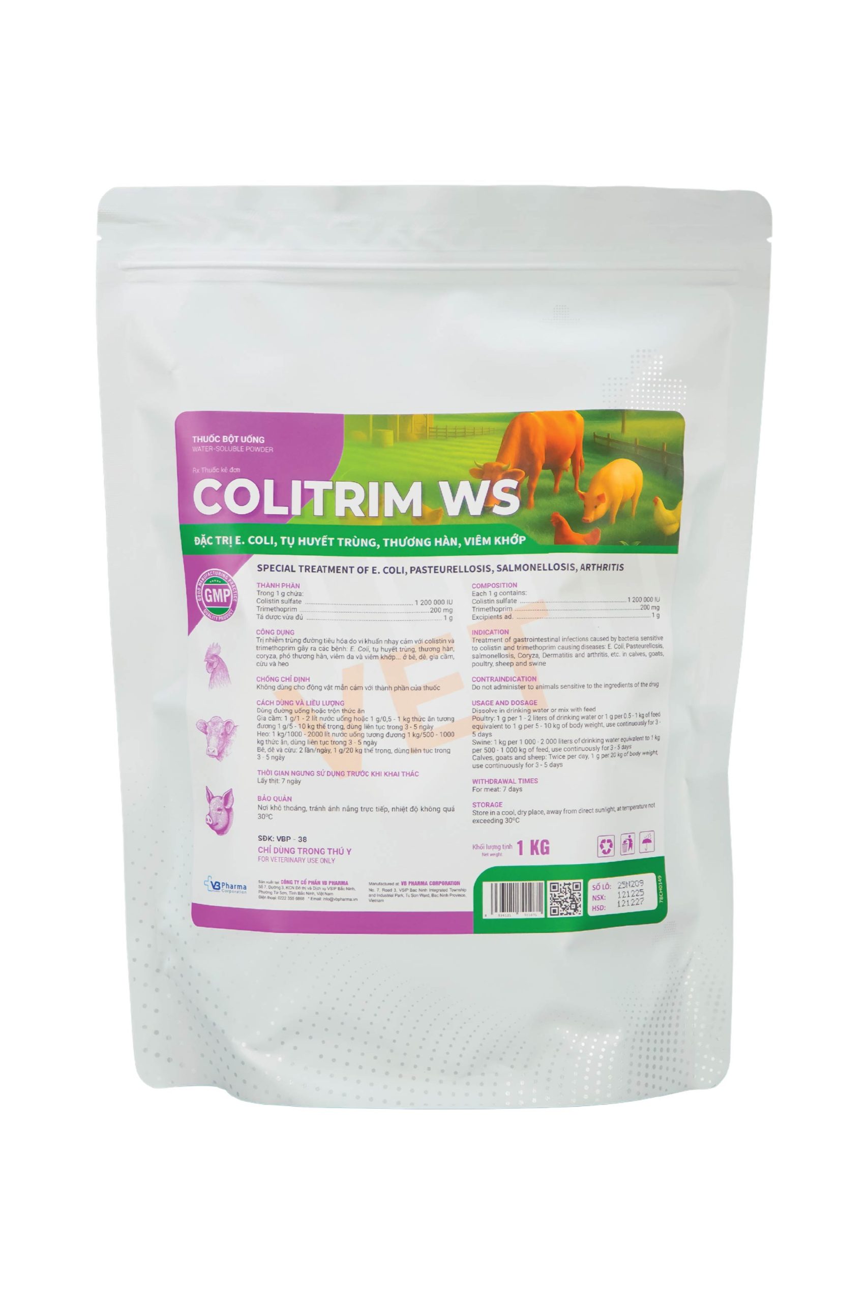 Prevention & treatment of gastrointestinal infections caused by bacteria sensitive to Colistin and Trimethoprim, causing E. coli, Pasteurellosis, Fowl typhoid, Coryza, Paratyphoid, Dermatitis, and Arthritis… in calves, goats, poultry, sheep, and swine